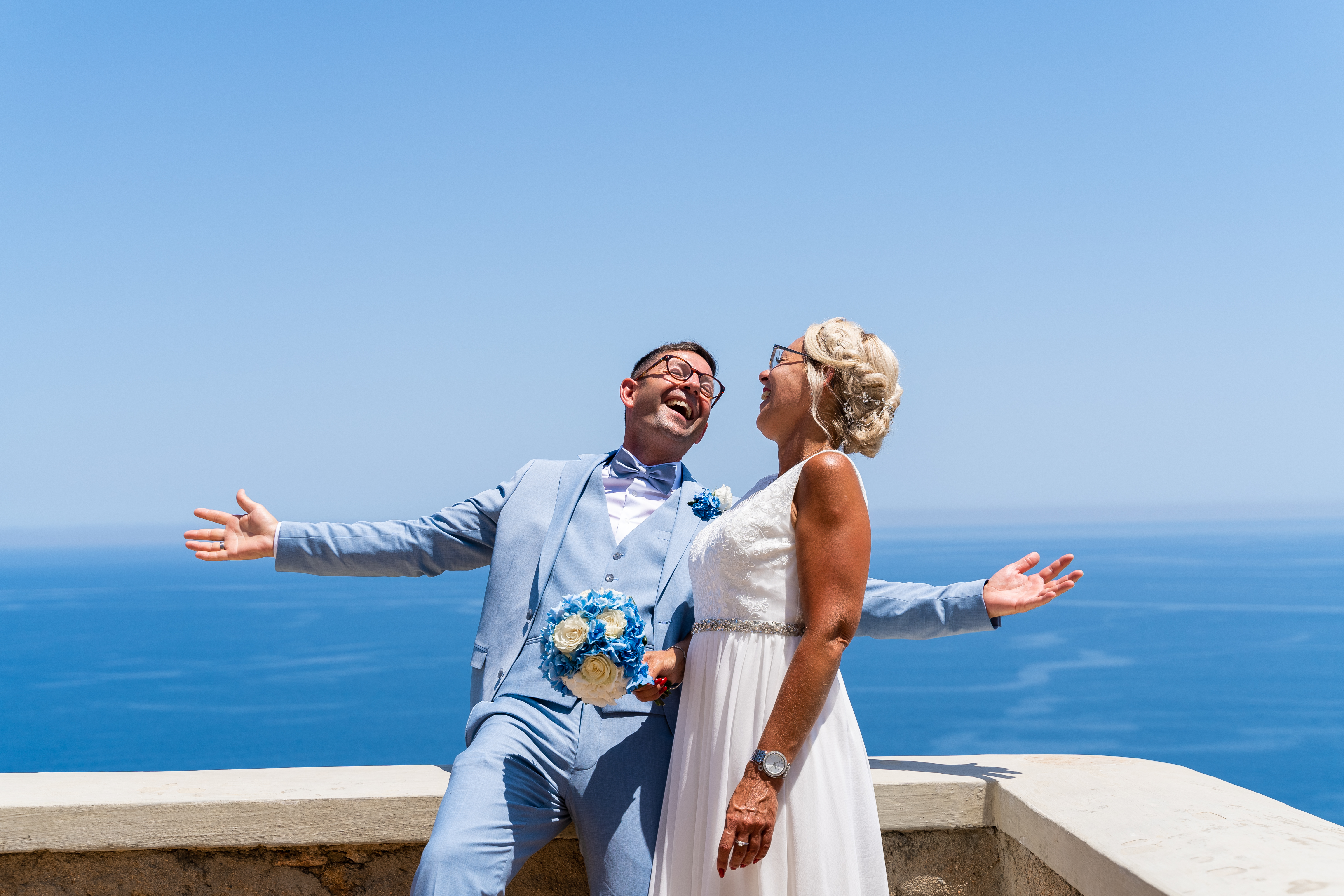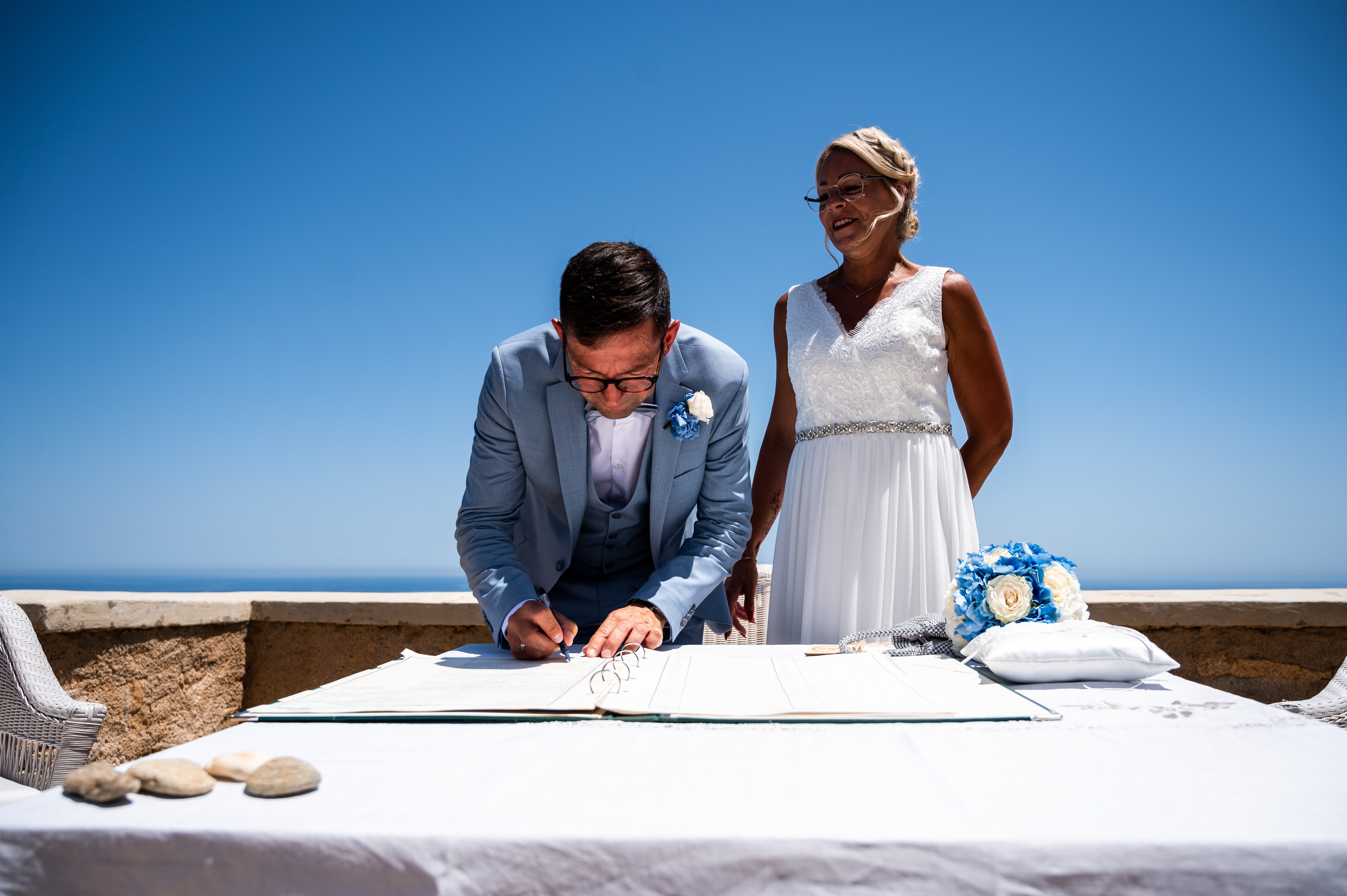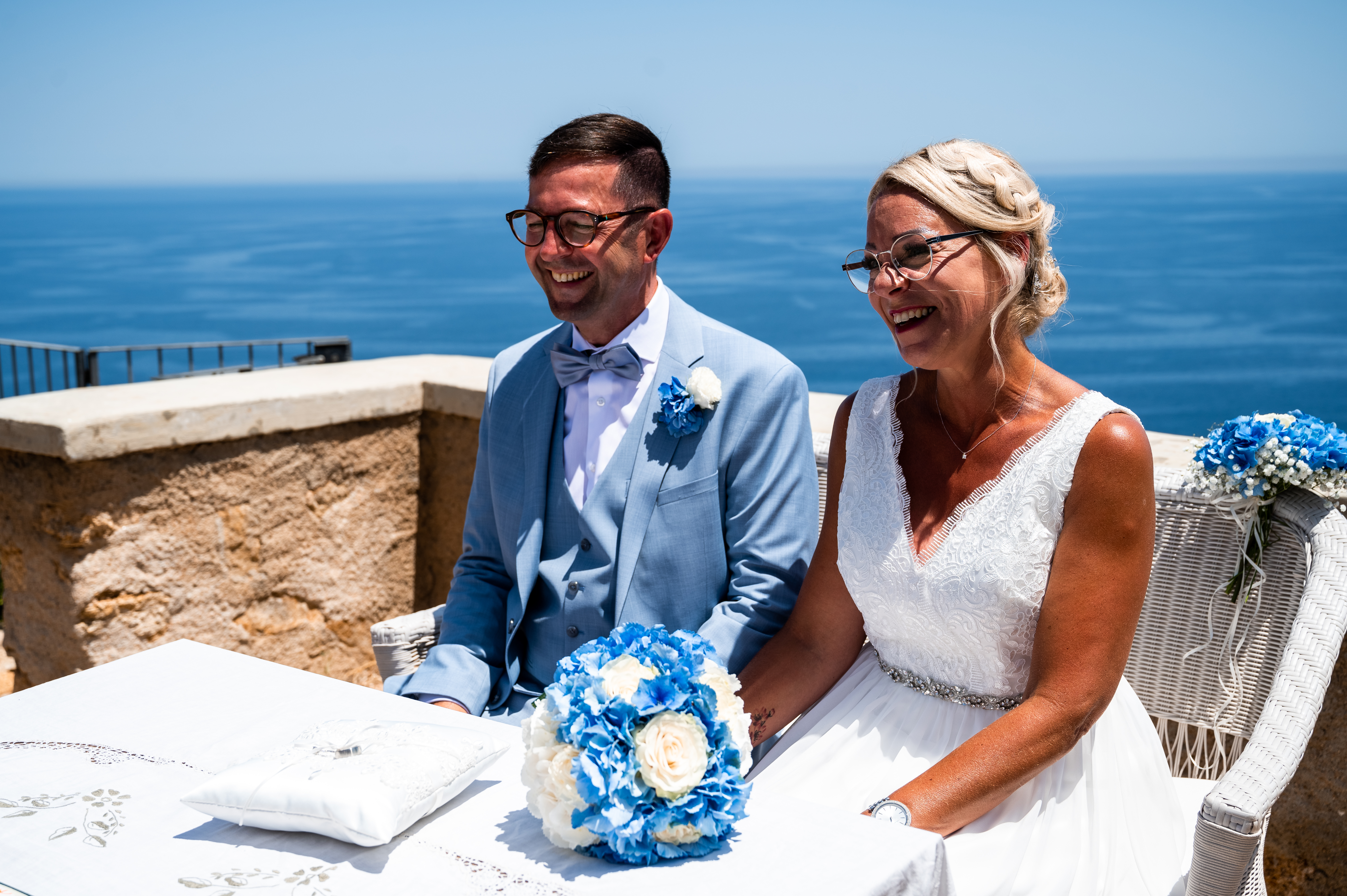 Mein süsses Traumpaar heiratet in den Farben Sardiniens, Blau und Weiß. Alles strahlt. Im Anschluß gehts zum Fotoshooting mit unserem Fotografen Adolfo an ausgewählte Locations mit sardischem Inselfeeling.