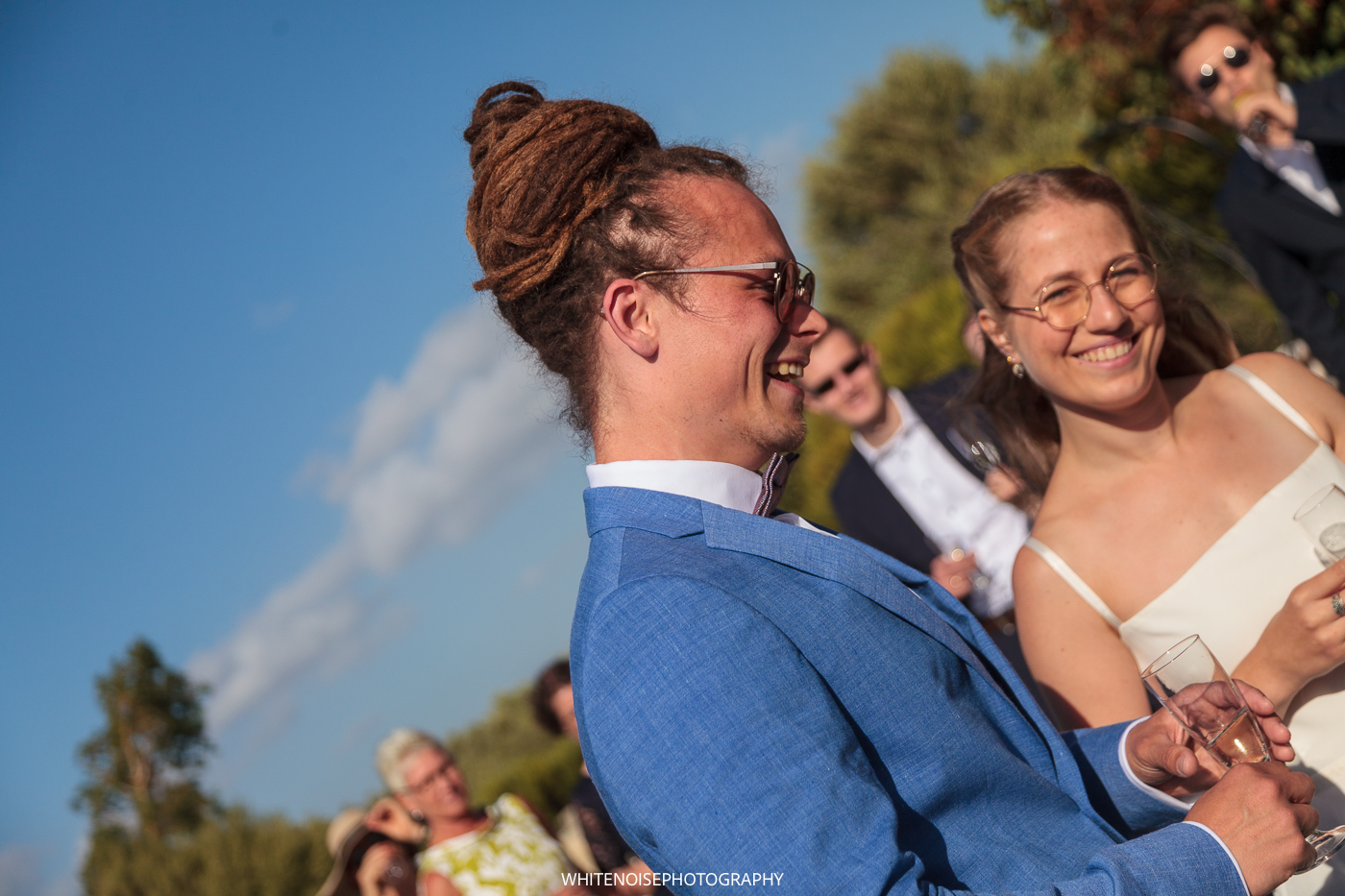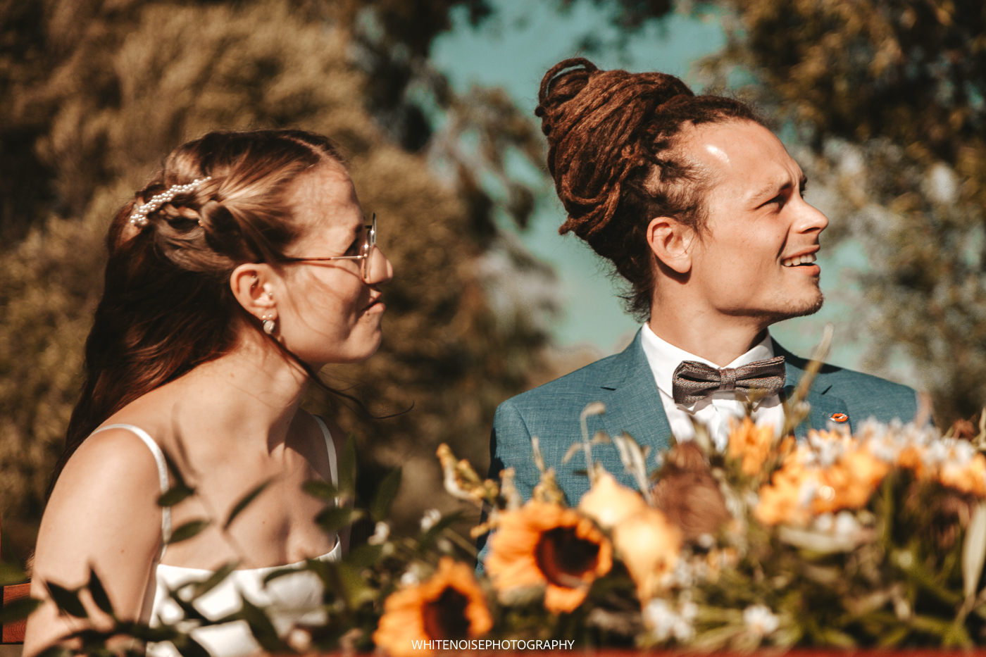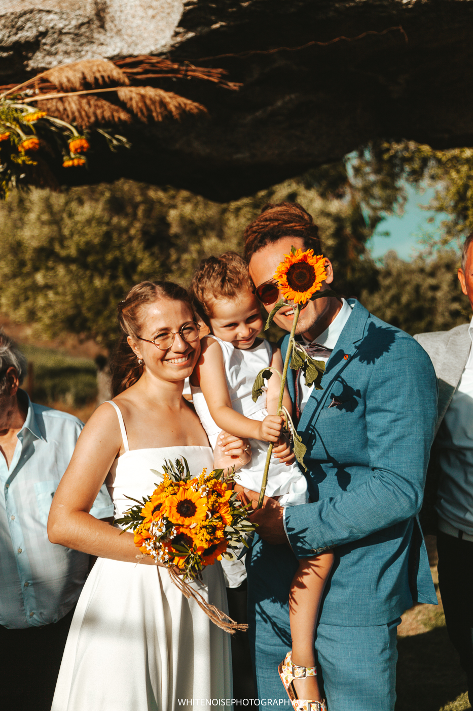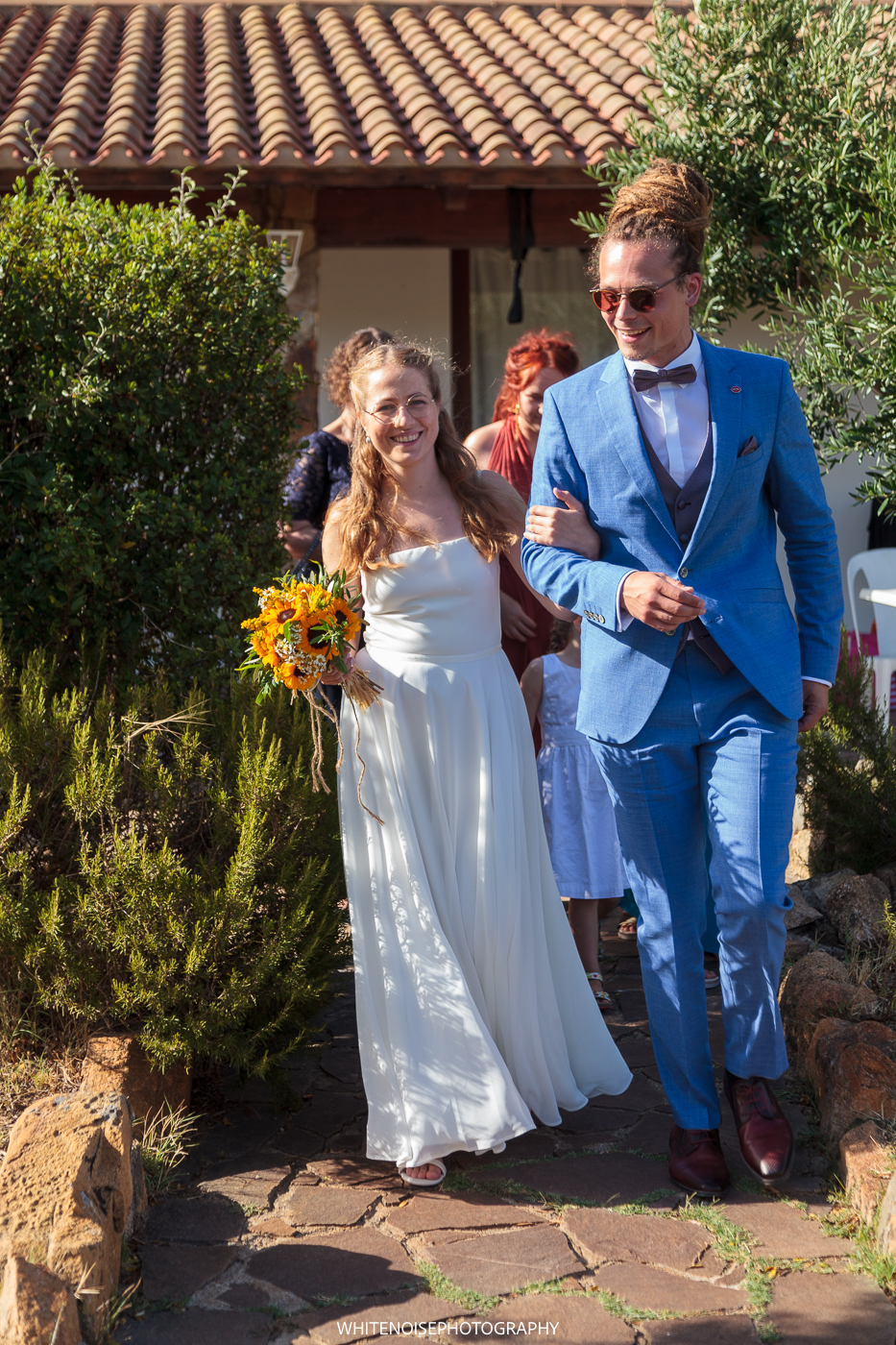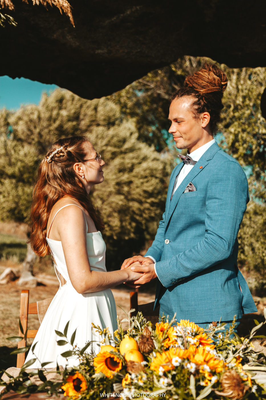 Mein Fazit eines wunderbaren Tages: viel Wind, ein tolles Paar, eine romantische freie Trauung unter dem wunderschön geschmückten Traubogen aus sardischem Granit, im Garten der schönen Location Quercia della Gallura. Überall der Duft von reifen Zitronen, sonnengelbe Sonnenblumen, Oliven, Kamille und sardische Kräuter, viel viel Spass und pure Romantik…