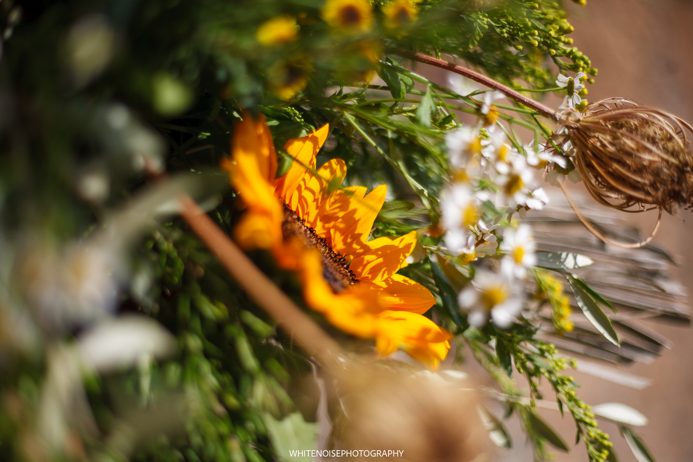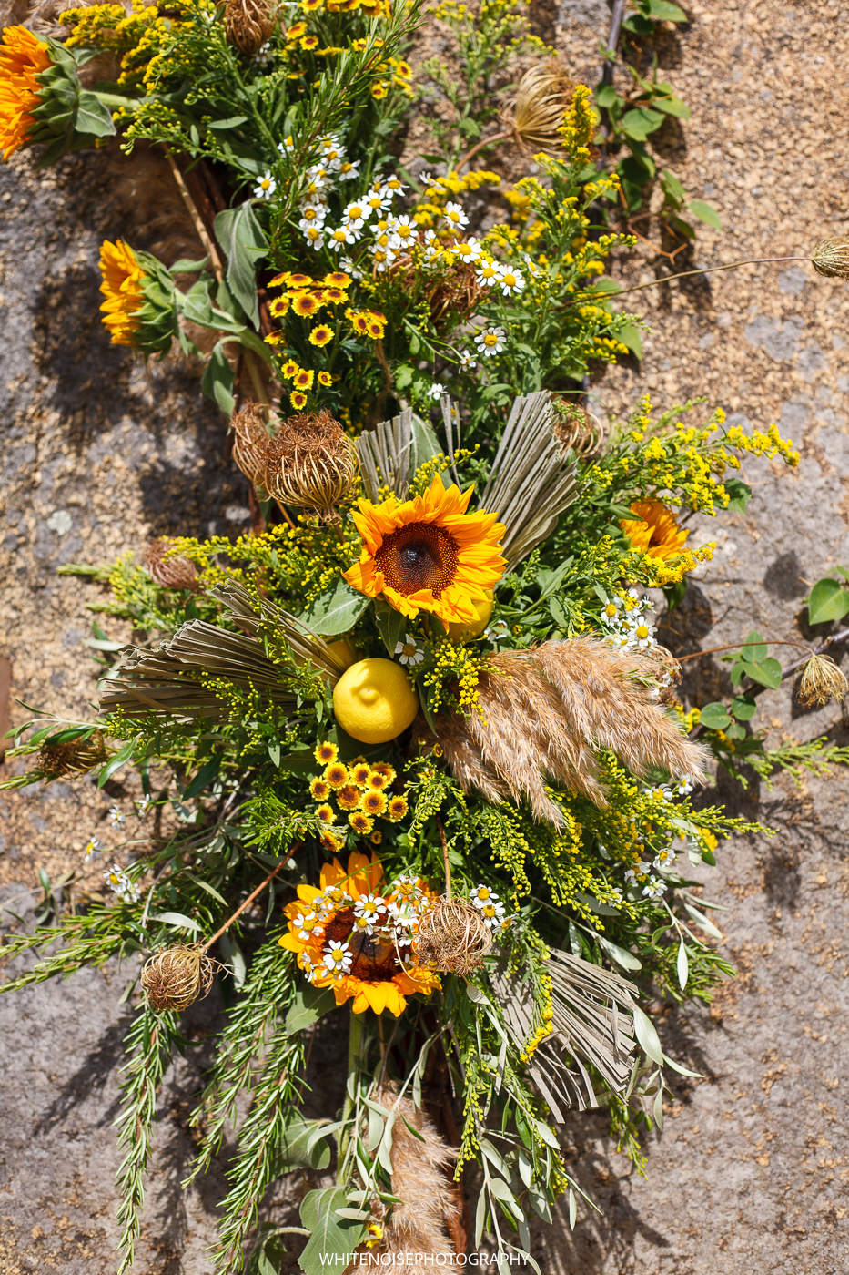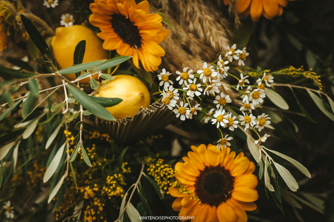 Die Deko unserer Traumhochzeit auf dem Land: sardische Kräuter, Sonnenblumen, Zitronen, Kamille, Oliven & Trockenblumen