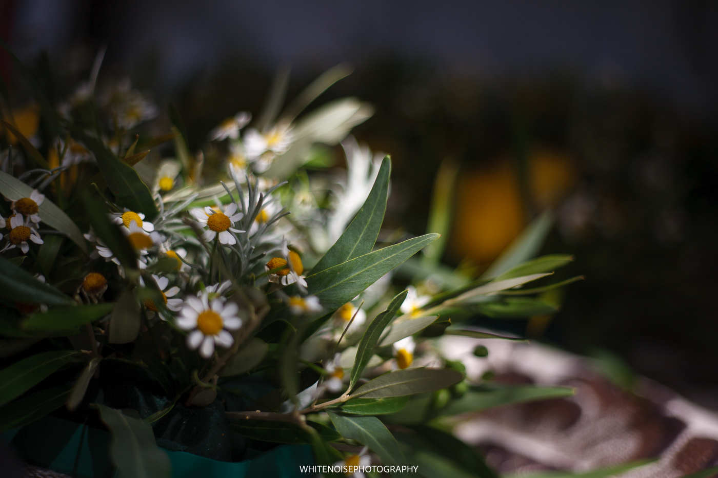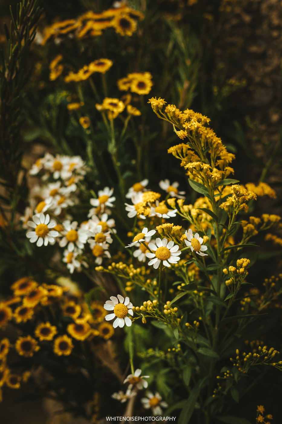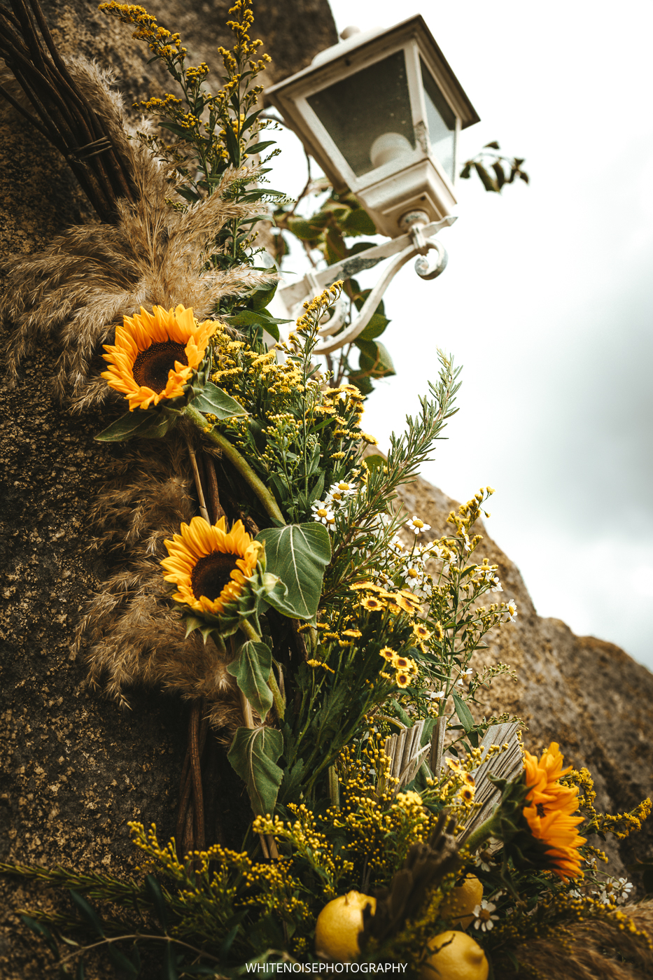 Die Deko unserer Traumhochzeit auf dem Land: sardische Kräuter, Sonnenblumen, Zitronen, Kamille, Oliven & Trockenblumen