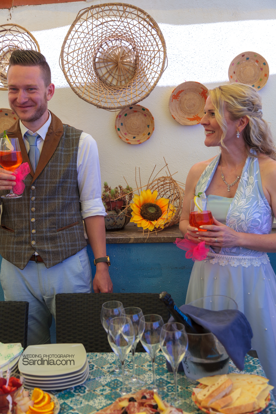 Nach der Trauung mit der sympathischen Standesbeamtin ging es zum Umtrunk auf die Dachterrasse eines charmanten kleinen Restaurants, wo die Gesellschaft das frisch vermählte Paar hochleben ließ. Mit atemberaubendem Blick über das azurblaue Meer und die malerischen Dächer Castelsardos genossen alle, spritzigen sardischen Sekt und eine kleine Auswahl köstlicher sardischer Snacks.