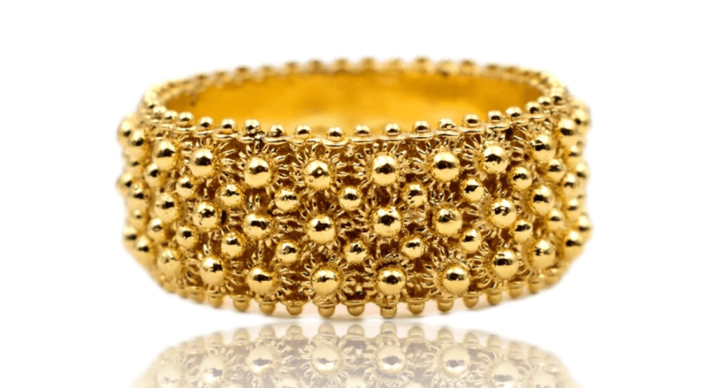 Der Ring soll der Braut Glück, Wohlstand, Fruchtbarkeit und der neuen Beziehung Stabilität bringen. Geformt und geschmiedet aus Fäden die das Wasserzeichen bilden, soll er die Trägerin mit dem Land und der Familie verbinden. Ein sehr schöne tiefe Symbolik.