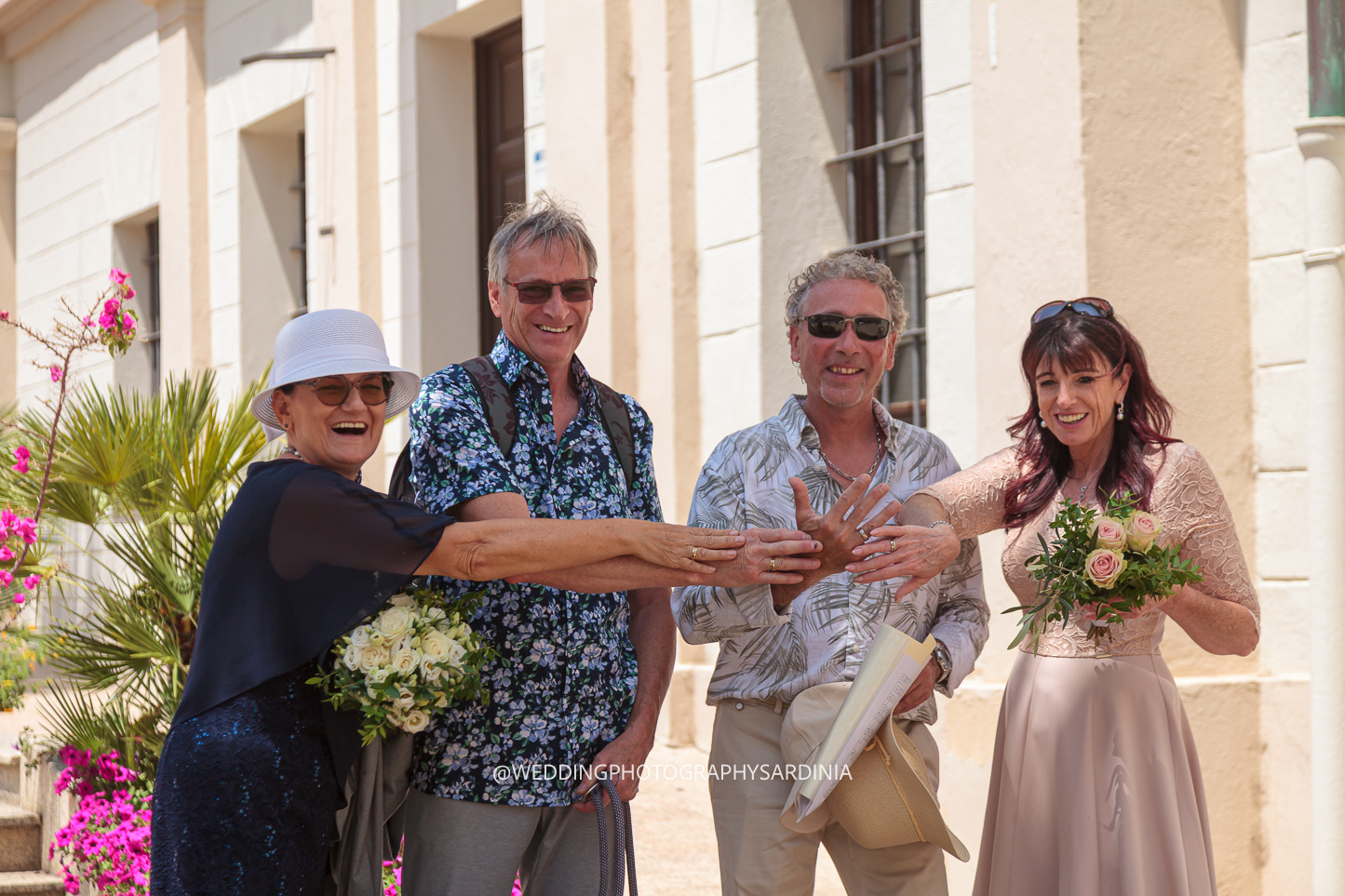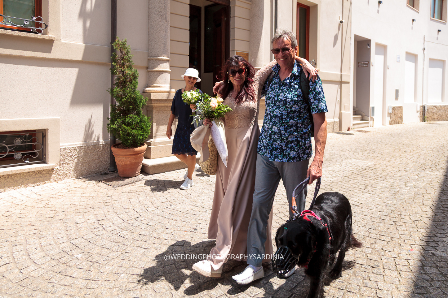 Aufregung lag in der Luft, begleitet von Lachen, Bellen des vierbeinigen Begleiters und natürlich ein paar Freudentränen – und ganz viel Sonne. Die Trauungen fanden, im wunderschönen Garten des Standesamtes von Olbia statt: auf dem Rasen, unter Pinien und den Blüten der Bougainvillea. Keine steifen Reden, sondern lachen und das, was zählt: Vier mal Si, aus vollem Herzen.